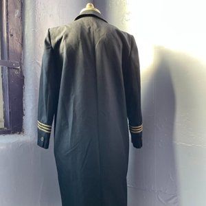 A deep navy , military style, double-breasted topcoat by The Kooples. Sturdy-but-not-heavy, fine-ribbed textured material. Bronze banding along cuffs. Excellent Condition.