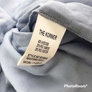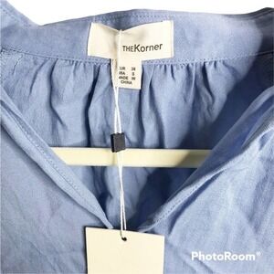 Brand new The Korner basic blue pullover long sleeve blouse. Fold over collar. Button cuff sleeves. V neckline. Semi high low hem.