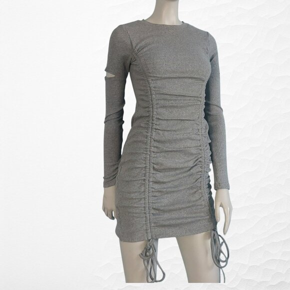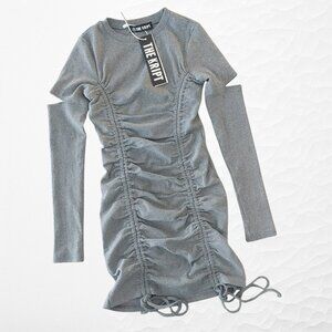 The Kript Ruched Bodycon Mini Dress Gray Large Long Sleeves Ribbed Knit NEW
