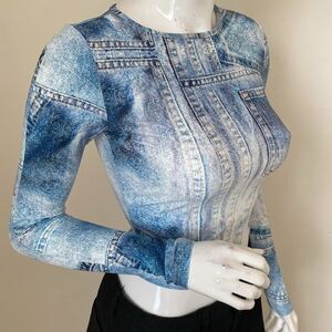 The Kript Sully Semi Sheer Mesh Denim Print Long Sleeve Fitted Crop Top