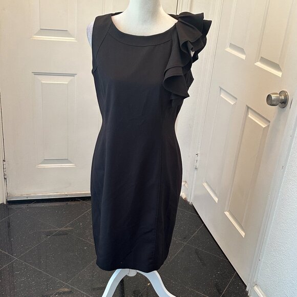 Calling all fashionistas! Own a piece of history with this iconic Calvin Klein little black dress - the ultimate wardrobe staple! This isn't just any LBD, it's a masterpiece of minimalist chic with a touch of playful whimsy. The over-one-shoulder ruffle is pure flamboyant femininity, adding just the right amount of sass to turn heads without going overboard.