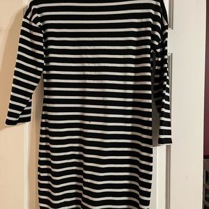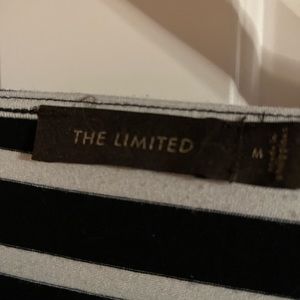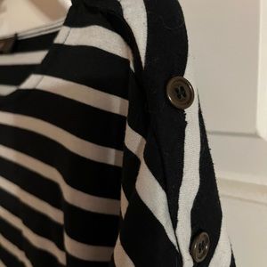 Dress from the Limited. Black and white stripes. 3 buttons on each shoulder. Length is to the knee or just over, depending on your height. Size Medium