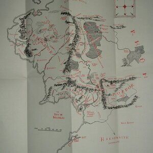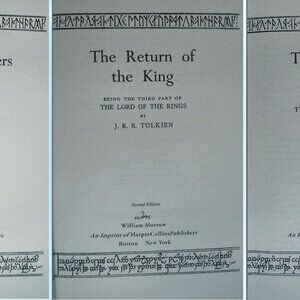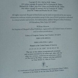 As new, 3 volume set of the Lord of the Rings titles in an as new slipcase. Each volume comes with an as new $28 priced dust jacket with illustrations by artist Alan Lee. The books are brown hard covers with emblems blind stamped on the front covers and the titles in gold on the spines. All of the corners are sharp and free from bumping. There is not signs or former ownership inside. There is a foldout map in the back of each volume. These are gift quality copies.