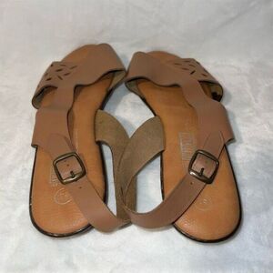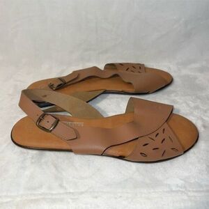This Leather Collection slingback sandal is designed for women and features a casual style suitable for summer. It is crafted from genuine leather in a brown color and includes a cutout design with an adjustable strap and buckle closure. The sandal is flat with a heel height under 1 inch and is made in Italy. The shoe size is 8.5 US. The item is pre-owned.