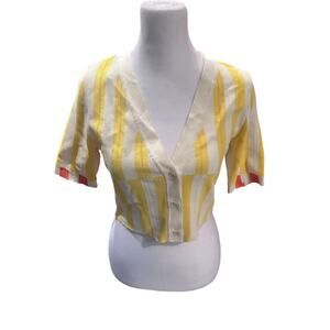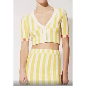Introducing the beautiful Leigh Cardigan by Solid & Striped, perfect for any fashion-forward woman. This sweater features a stunning yellow color and is made with high-quality materials, ensuring both comfort and style. The cardigan is designed with a regular size type and is available in size small, making it the perfect addition to any wardrobe.