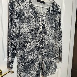 The limited size large. 3/4 sleeve cardigan. Off-white with a beautiful black design. Lightweight with a round neckline.