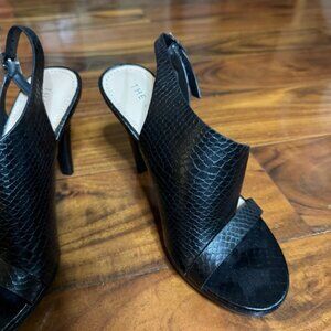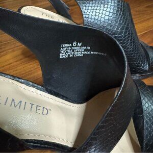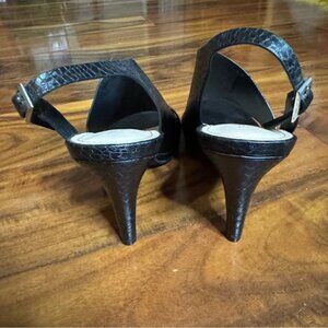 These black heels from The Limited feature a sophisticated slingback design with a peep-toe and a textured leather finish. The open back with a strap adds a touch of elegance, making them perfect for both casual and dressier occasions.