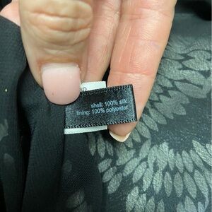 This beautiful skirt is 100% Silk and is fully lined. It is in outstanding condition. It has a side zip with a hook and eye closure.