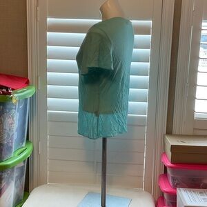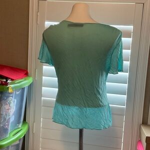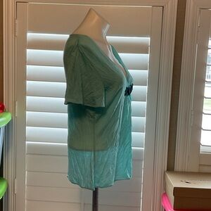 Chic aqua blouse with a flattering V-neck. Features elegant embellishments. Ideal for versatile styling