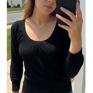 Chic and versatile black sweater top from The Limited, perfect for layering or wearing solo. Features a flattering scoop neckline, gentle ruching at the shoulders, and a fitted waistband for a polished silhouette.