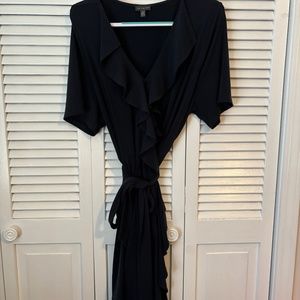 Elegant black midi dress. Features ruffle details. Short sleeves. Wrap style with tie waist.