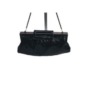 The Limited Black Sequin Handbag is a stylish and versatile accessory for various occasions. This medium-sized handbag features a rectangular shape with a sequin/ metallic exterior and a black metal chain handle clasp. It has a clasp closure.