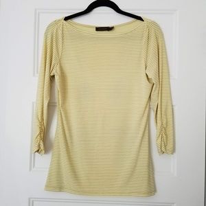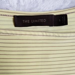 Super soft top from The Limited. Beautiful soft yellow color with tiny brown pinstripes. Rouching on the ends of the 3/4 length sleeves. I am hesitant in selling this one! looks great with a blazer on top and a long necklace for work. Size Small. Bundle to save! Smoke free and immaculate home. Don't hesitate to reach out to me if you have questions!