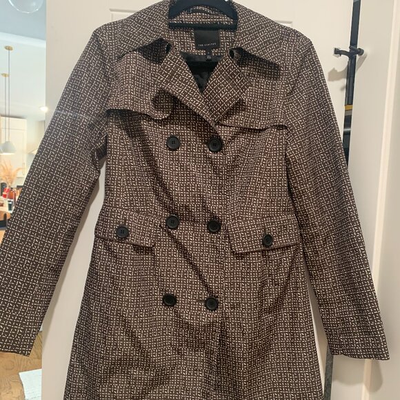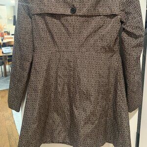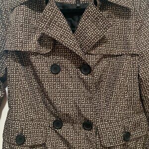 Beautiful brown/white print jacket with black buttons. Outer shell is polyester and waterproof with a polyester lining. Perfect condition.