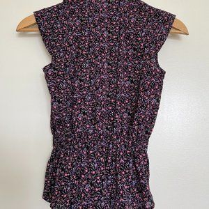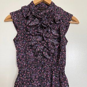 So many details! All kinds of cute! Tiny pink and purple flower print. Rounded collar and button down front. Ruffles at the bib. Cinched waist and cap sleeves. 97% polyester/3% spandex. Machine washable from smoke free home. Sold alone, but happy to bundle!