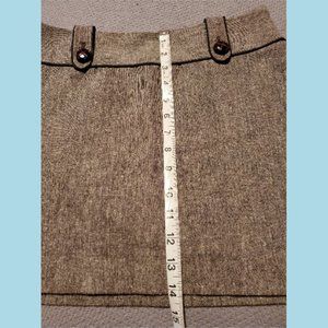EXCELLENT CONDITION!! Wear for business or casual, this textured brown skirt will fit in any ensemble. Built-in brown polyester lining and a side-zipper with hook and eye clasp. 14" Long with button details on front.