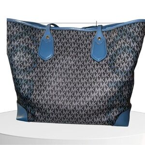 • Distinctive Colorway: While the classic MK monogram is timeless, this particular iteration features a captivating dark grey/black monogram paired with vibrant, eye-catching blue leather trim and handles. This striking combination sets it apart from standard seasonal offerings.