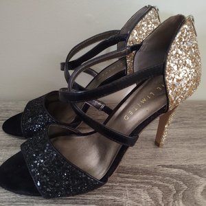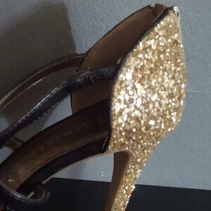 Elegant gold glitter heels. Perfect for special occasions. Stylish and eye-catching design.