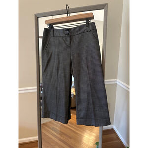 New with tags, The Limited Collection Cassidy Fit culottes in size 2. The material is 76% polyester, 22% viscose rayon, and 2% spandex. These gray culottes feature a subtle grid pattern, double-button closure, front pockets, and a wide-leg design that falls below the knee. The item is in pristine condition, with no visible imperfections.