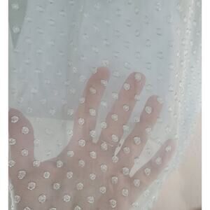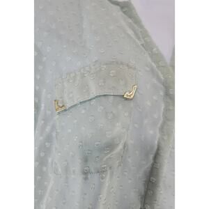 green, sheer, lightweight, 3/4 sleeves, v-neck, hidden button closure, raised sheer dots on blouse (see picture)