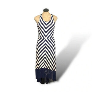 The Limited High-Low Dress is brand new with tags. Navy blue and off-white striped dress with a sheer bottom hem. Measurements flat: pit to pit 15”, waist 13”, shoulder to waist 19.5”, front waist to hem 28”, front length 48” and back length 58”. Materials: 94% polyester and 6% spandex. Dress has lots of stretch to it.