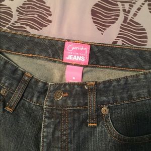 Dark wash blue jeans with cute sparkles on the back pockets. A few sparkles have fallen off but otherwise in great shape. Very little wear on the bottom.
