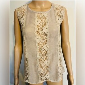 This elegant tan blouse from The Limited features a delicate lace design, offering a sophisticated touch to your wardrobe. The sleeveless tank top style ensures comfort and versatility, making it perfect for both casual and dressy occasions. The intricate lace detailing adds a subtle contrast, enhancing its overall charm. Like new condition. No rips or stains. Such a pretty top 😍