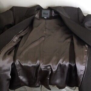 The Limited Luxe Wool Suit Blazer sz 10, Dark Olive Brown with Grey Pinstripes, Double Button Front, Lightly Padded Shoulders, Faux Front Pockets, in great pre-owned condition
