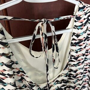 Stylish dress with vibrant patterns. Ideal for versatile wear. Elastic waist. Tie in back at neck.