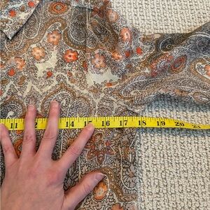Stylish paisley button-up shirt with vibrant patterns. Features shades of orange, brown, and cream.