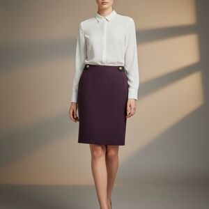 Elevate your look with The Limited Pencil Skirt—a timeless knee-length cut in rich burgundy with sleek black trim. Accented with gold crest buttons at the waist for a polished, military-inspired touch. Fully lined for comfort and shape.