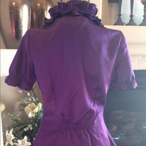 The Limited purple ruffled top, zipper on left side, shiny and stretchy. 96% polyester 4% spandex