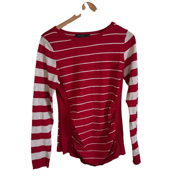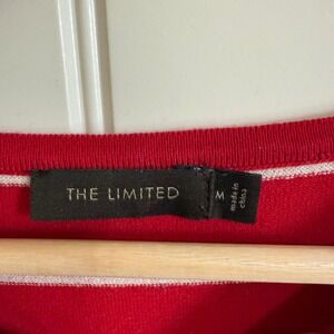 Keywords: The Limited, Red Striped Sweater, Long Sleeve Top, Knit Sweater, Womens Medium, Ruched Detail, Striped Top, Casual Sweater, Comfortable Knit, Classic Style, Fashion Top, Womenswear, Contemporary Fashion, Red and White