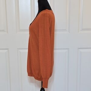 Elegant V-neck sweater by The Limited. Soft fabric with a warm orange hue. Ideal for layering or wearing alone. 50% merino wool