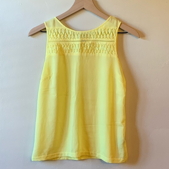 Bright yellow tank/shell from The Limited. Smocked and polyester front give this top a classy, dressed up look with comfortable feel. Rayon/Spandex back feels like a t-shirt. EUC