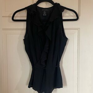 This is a black vintage silk blouse from The Limited in size medium. It features a feminine wrap style with a V-neckline, sleeveless design, and ruffle accents. The closure is a tie, and the garment care instructions recommend dry cleaning. This versatile top is suitable for various occasions such as travel, parties, casual wear, or business attire, making it a chic and elegant addition to your wardrobe for the summer, fall, and spring seasons.