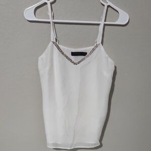 Elegant white top featuring a stylish embellished neckline. Perfect for any occasion. camisole tanktop blouse top shirt