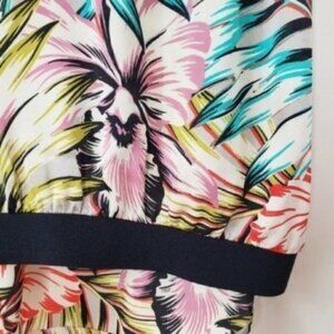 Fun tropical print tank top with banded elastic hem in front, longer in back.