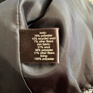 - Trim: 51% wool, 38% polyester, 11% other fibers