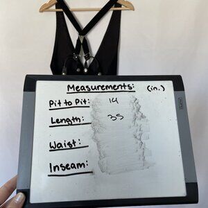 Classic suspender style dress featuring a button-up front and adjustable straps. Elegant black fabric with subtle silver detailing adds sophistication.