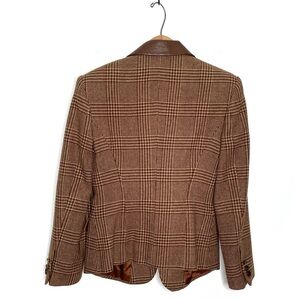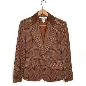 Excellent, like new condition! Comes with extra buttons. Brown houndstooth pattern. 100% leather collar. One button closure. Front pockets. Fitted. Brown tones. Size XS. 18” armpit to armpit. 26” length.