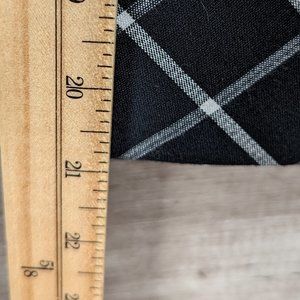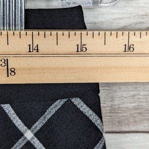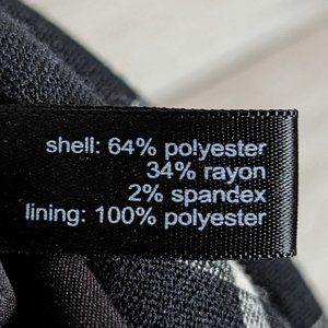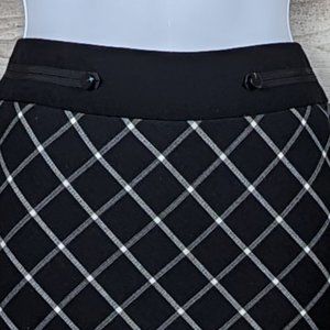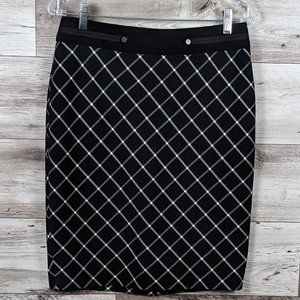 Pre-Owned Condition! 64% Polyester/34% Rayon/2% Spandex. Lining 100% Polyester. Beautiful Black & White Diamond Print Design on a Midi Pencil Skirt with a 5" Back Slit.