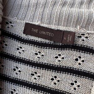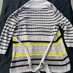 This cardigan by The Limited offers a blend of style and comfort, thoughtfully crafted with a striped pattern accentuated by vibrant yellow detailing. Its open front design and accompanying belt provide versatility in wear, whether casually draped over a simple tee or cinched for a more tailored look. With a full-length sleeve and shawl collar, it is both stylish and functional, suitable for various settings.