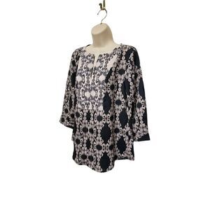 The Limited Women's Sz M Blouse Black & Ivory print V-Neck 3/4 Sleeves With Buttons. This blouse is in excellent condition no flaws