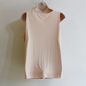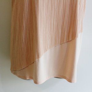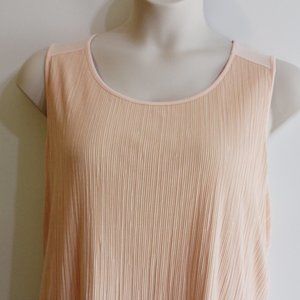 This solid pale orange pull over tunic top is sleeveless with a scoop neck. The front has an outer layer with cascading dainty pleats and a diagonal raw hem. It is new with tags.