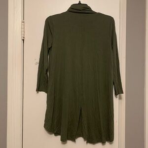 Women’s olive green dress from the Limited. It is a size Medium. Neck area has a collar. Front of the dress has a double layer look. 3/4 length sleeves.