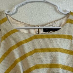 Vibrant yellow and white stripes. Sleeveless design. Perfect for casual outings.