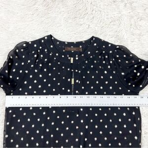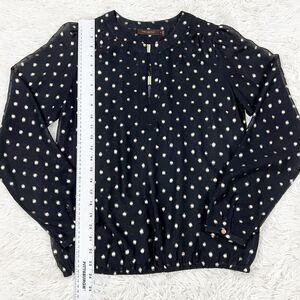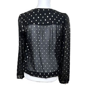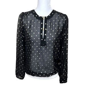 Super cute pre-owned The Limited Black and Gold Metallic Polka Dots Sheer Long Sleeve Blouse Size Small. Elastic waist. Gold metallic buckles on front. This top is sheer and will need a cami on underneath it. No stains or holes. Please ask all questions before purchasing.