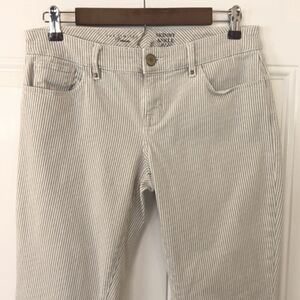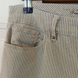 The Limited and white pinstripe five pocket 917 skinny ankle pants. Pants have mild barely noticeable staining on the seam of left leg, please refer to picture six.