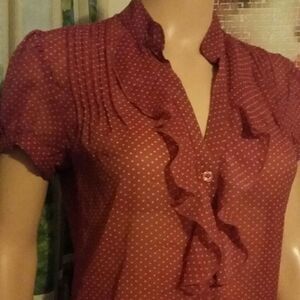 First 2 photos portray accurate color, maroon. Button down.